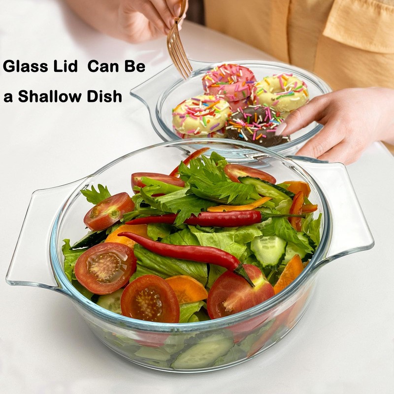 - √ Covered Glass Dish for Baking : Lid is also useful as cookware or a quick plate. Get this glass casserole dish, you will get both casserole dish & a shallow glass baking dish as bonus. The shallow baking dish can be as a serving dish for vegetables, salad, cookies, fruits, burrito, shepherds pie etc. Also the glass cover can be used directly in microwave oven and toaster for baking and heating.