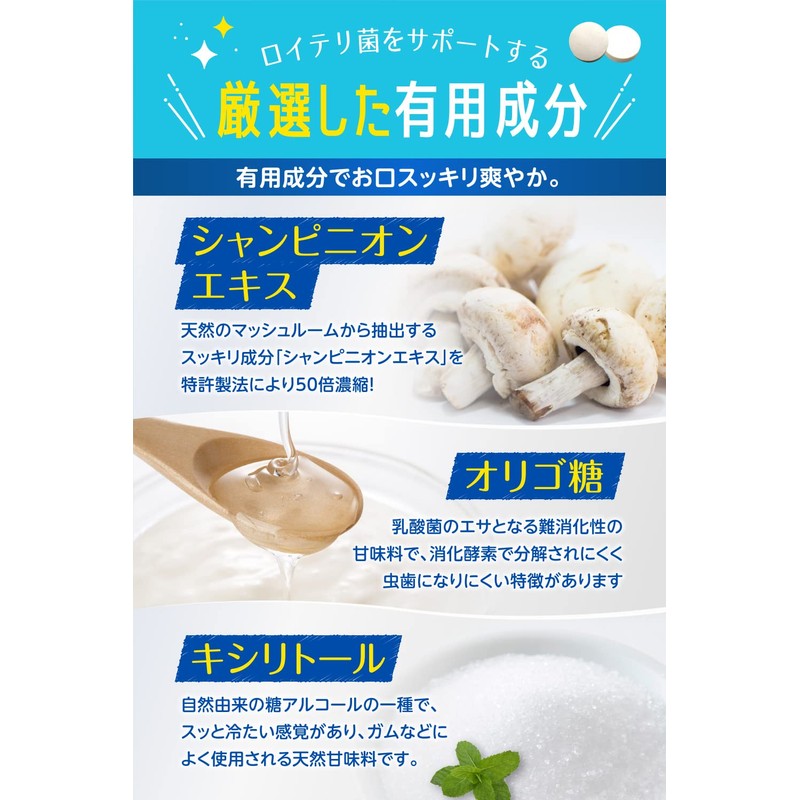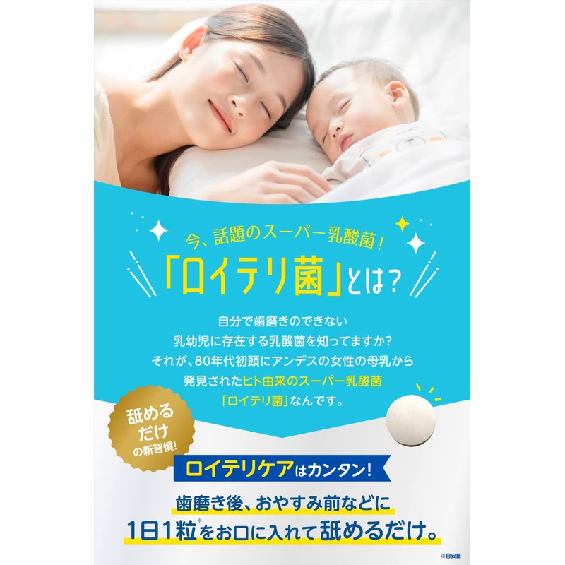 お休み前、歯磨き後のロイテリ習慣、生きてる乳酸菌※1をお口にチャージ! ※1.第三者検査機関にて乳酸菌数検査実施 / ヒト由来のスーパー乳酸菌「ロイテリ菌」を1粒に10億個配合(原材料配合時)/ 無着色・保存料無添加 / 舐めやすい1粒のサイズは直径1cm / 歯磨き後、お休み前に1日1粒をお口に入れて舐めるだけ。 / ロイテリ菌をサポートする厳選した有効成分 / シャンピニオンエキス 特許製法による50倍濃縮シャンピニオンエキス /オリゴ糖 乳酸菌のエサになり、砂糖よりも虫歯になりにくい甘味料です。 / キシリトール 虫歯の原因になりにくい糖アルコールでガムなどによく使われる甘味料です。 【2022年9月22日販売分より、原材料に麦芽糖を使用しておりません。資源の有効活用として、原材料箇所に変更後の原材料表示のシールを貼って対応しております。】