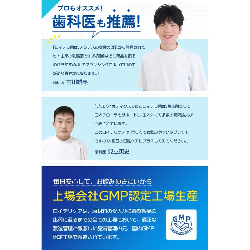 • 【息さわやか、笑顔に自信!】歯科医・歯科医院で推奨されているロイテリ菌サプリメントを、より手軽に継続できるお値打ち価格で新登場!ヒト由来の『世界が注目する話題のスーパー乳酸菌』であるロイテリ菌を1粒あたりに10億個配合しています。善玉菌をお休み前、歯磨き後にお口にチャージ!おやすみ前や歯磨き後のケアにぴったりなサプリメントです。口臭ケア、日々のお口のケアに取り入れて、スッキリとした毎日を過ごしましょう。