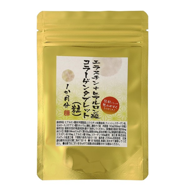 • 【栄養成分表示[1粒250mgあたり]】熱量0.56kcal、たんぱく質0.02g、脂質0.004g、炭水化物0.12g、食塩相当量0.007g、エラスチン100mg ヒアルロン酸100mg コラーゲン100mg配合】