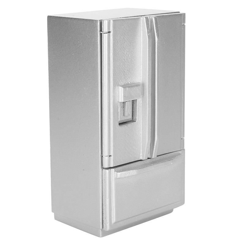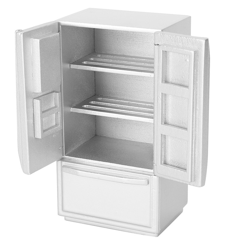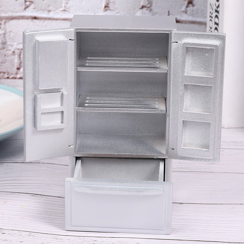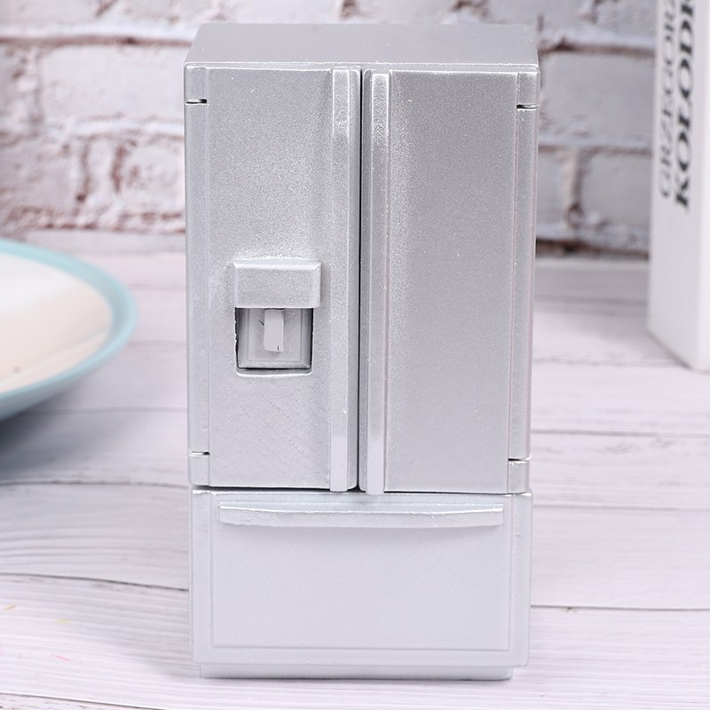 1: 12 Mini Birch Wooden Double Door Double Deck Simulation Refrigerator Model for DoorhouseSilver