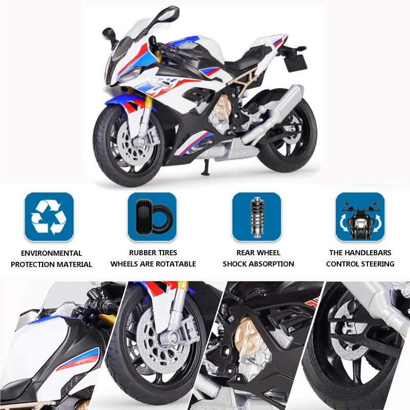- [Proportional size]: 1/12 scale 2021 S1000RR Motorcycle Model size:About 17.5cm X 9.7cm X 7cm manufactured according to the original size of the motorcycle, exquisite details, real display, more decorative and playable