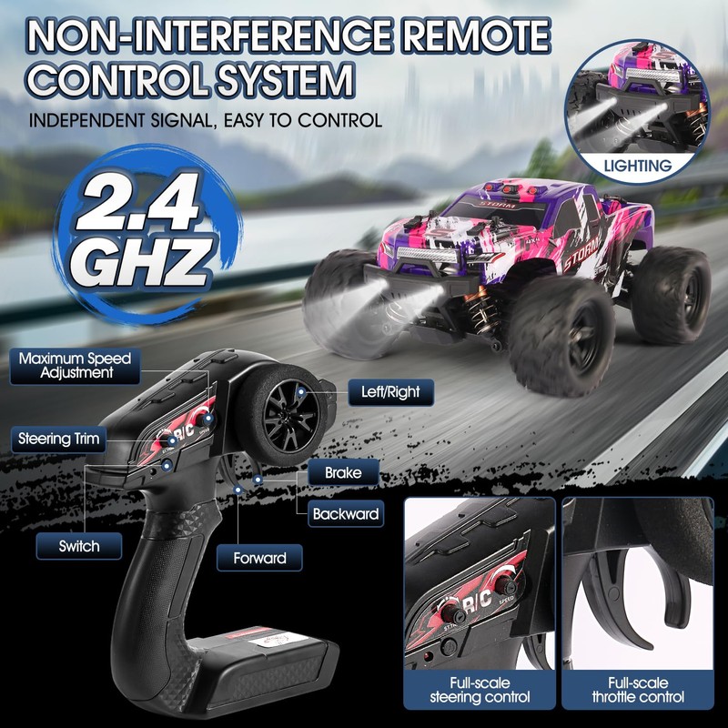 - 【1:18 scale High-Speed RC Car】Our high-speed Remote Control Car is designed for beginners adults and children, equipped with a powerful RC380 engine and cool LED headlights, bringing you the thrill of 40+ KM/H high-speed racing, excellent climbing ability, you only need to control the steering wheel and trigger to enjoy the exciting racing experience!