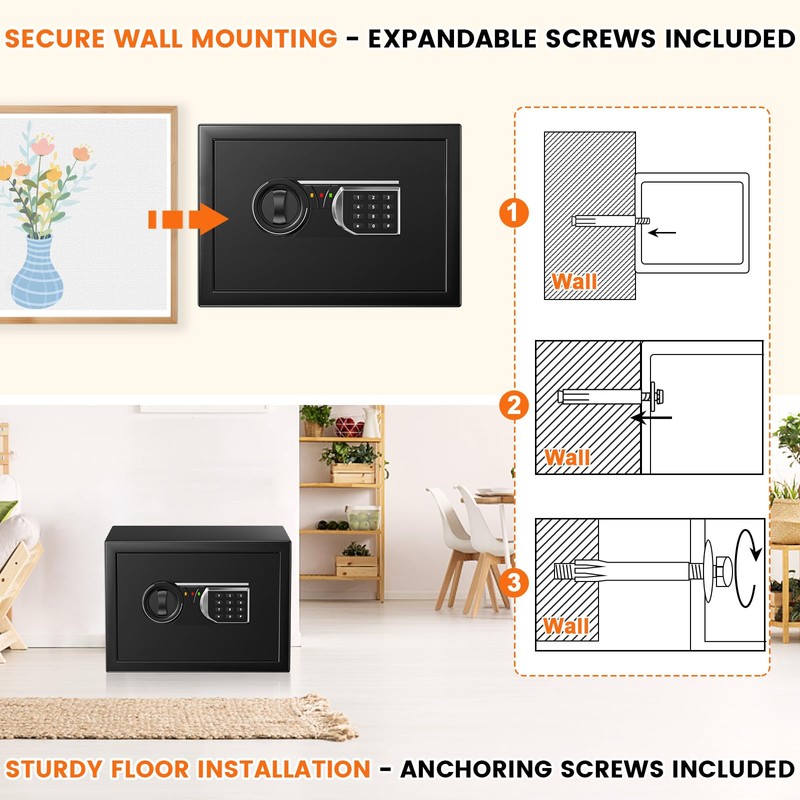 - Hidden Safe & Wall/Floor/Closet Installation: This steel security safe with combination lock includes pre-drilled holes in the bottom and back for secure installation, accompanied by expansion screws for permanent affixing to a wall or floor. This allows you to prevent theft by keeping the safe lock box firmly in place. The design allows for seamless integration into your living space without drawing unnecessary attention