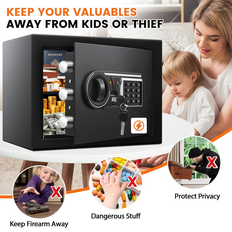 - ELECTRONIC KEYPAD & SPARE KEY: Our home security safe is designed with responsive electronic keypad and spare key. The programmable code makes it quick and convenient access to the contents of the safe in your daily use and don’t have to worry about hiding & keeping track of a key. If you forget the password or the battery runs out, you can use the external battery case coming with.(Note: Do not place spare keys and emergency battery packs in the safe)