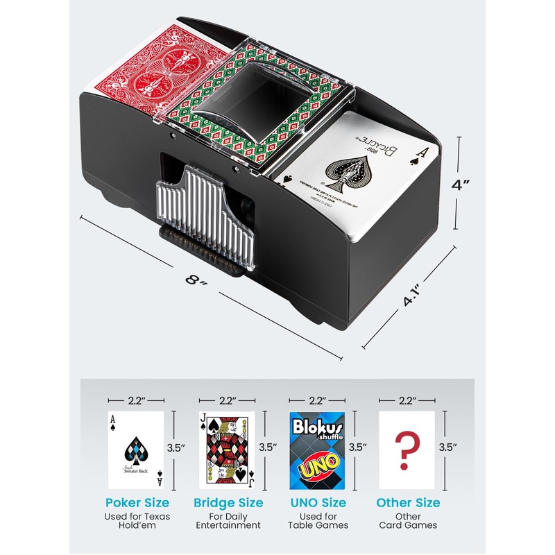 - 【SHUFFLE THOROUGHLY】 The Poker shuffler machine features innovative gears on both sides that drive the playing cards into the tray swiftly and smoothly, ensuring an even and accurate shuffle. Powered by 4*AA batteries (not included).