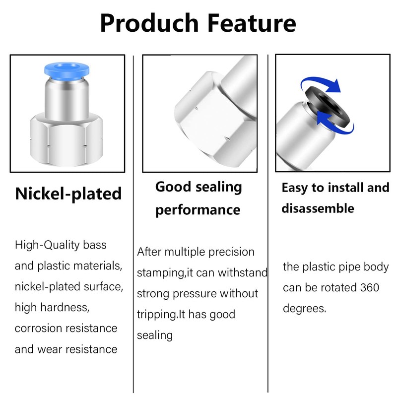 - 6mm tubing to 1/2 npt push in Fittings is made of Nickel Plated Brass and quality plastic- corrosion resistance, ductility