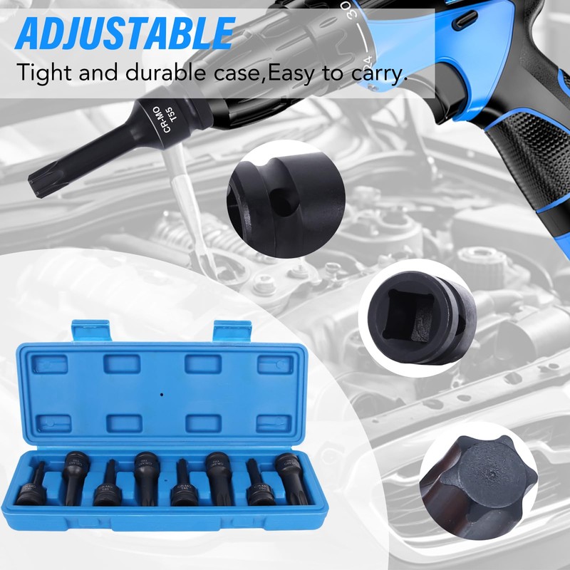 - [Wild Use]:With an impact drive design, our Torx bit sockets deliver superior performance and durability, making them the perfect choice for professional mechanics, DIY enthusiasts, and more. Whether you're working on cars, motorcycles, bicycles, or household projects, this versatile set has got you covered.