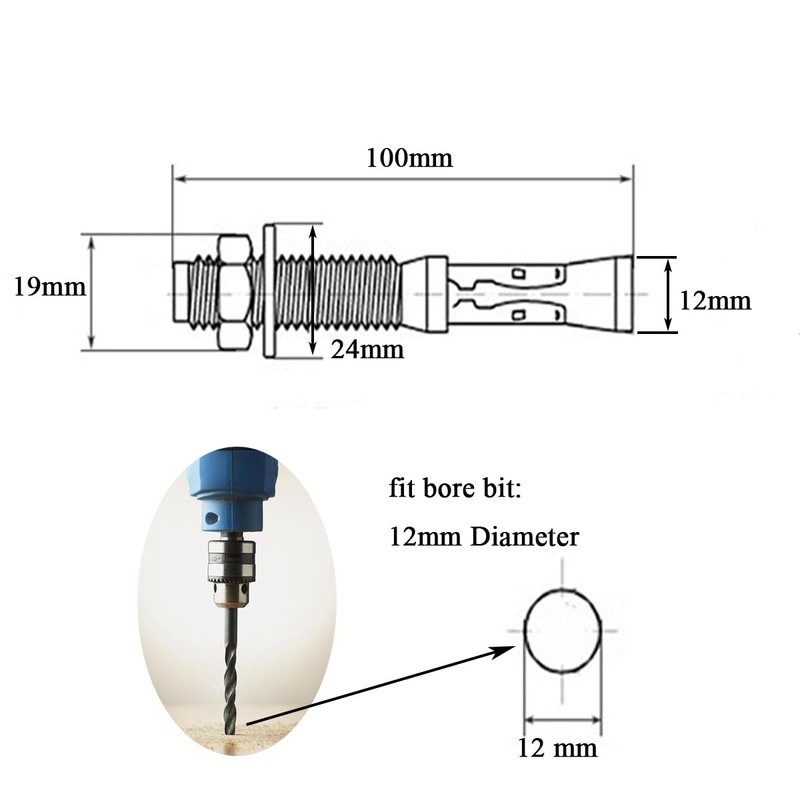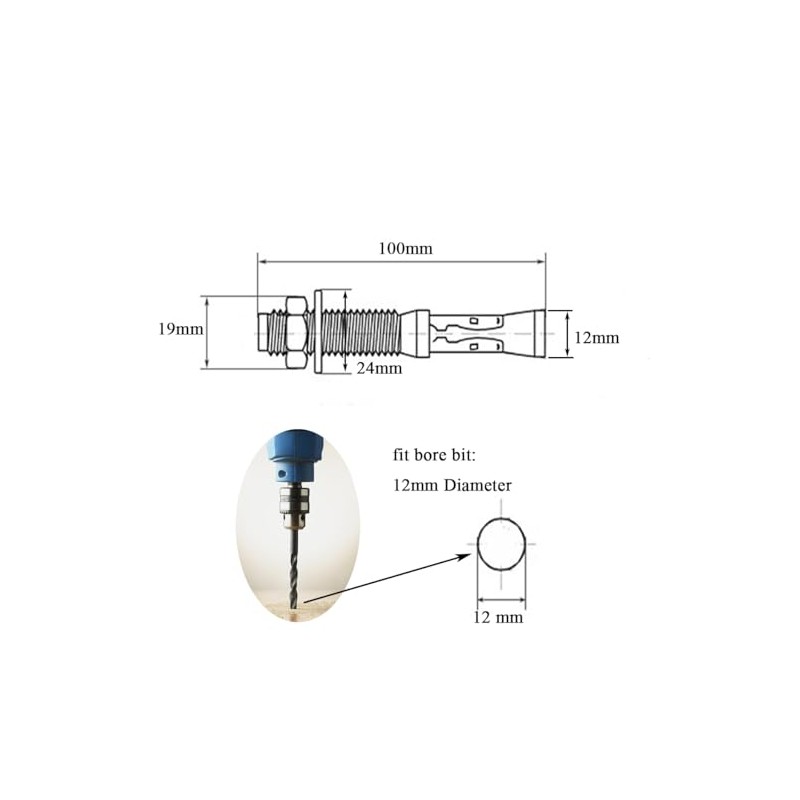 • Installation - Drill bit diameter/Hole diameter is the same as anchor diameter. Use a suitable drill bit to drill a hole in the base material (Concrete only). And Then tap the wedge anchor into the hole and screw the nut to complete the installation.