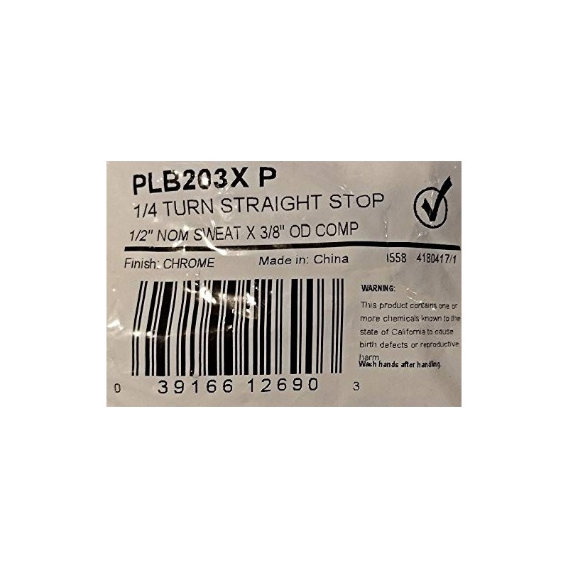 NEW In Package - 1/2" Nominal Sweat x 3/8" OD Compression 1/4 Turn Straight Stop Valve - Chrome Plated Brass - Compatible with copper pipe - For use in potable water distribution systems - 1/4 turn ball stop; easy on/off operation with a 90 degree turn of the handle - For use with water connections in exposed locations only - Attractive chrome finish - Temperature rating: 40 degrees F to 140 degrees F - Pressure rating: 125 PSI maximum - BrassCraft PLB203XP