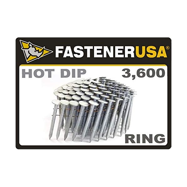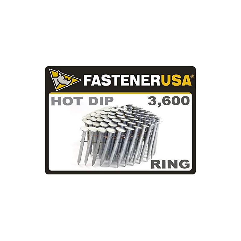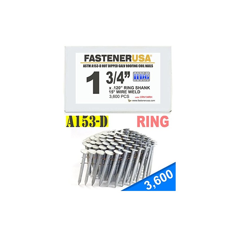 All our ASTM A153-D Hot Dip Nails meet and/or exceed the United States standard for Hot Dip Zinc Mass Coating of ASTM A153 class D Fasteners. HDG grade nails are first cut to length and heads formed from a large spool of brite steel wire rod. Then nails are Hot Dipped into Molten Zinc until a thick uniform coating is achieved across the entire surface of the nail. Next, the nails are either packaged in bulk or collated together into strips or coils. Our HDG Nails meet and or exceed the ASTM A153 Class D Fastener specification. Manufactured according to roofing industry specifications; these HOT DIPPED nails are 15 degree wire collated, 1 3/4" length with a head diameter of .375" (approx. 3/8" diam) and .120" (11 gauge) RING shank. Ring shank nails, also known as annular thread, offer superior holding power and helps prevent nails from backing out over time. Commonly used in composition asphalt shingles applications. Meets the minimum requirement for ACQ Treated Lumber but is Not Recommended. For ACQ Treated lumber we recommend Stainless Steel. Each box contains approximately 3,600 nails. Applications Include: Asphalt and fiberglass shingles for both new roofs and reroofing. Also for attaching waterproof tar paper, roofing felt, metal drip edges, insulation board, cementitious fiber board products and vinyl siding.