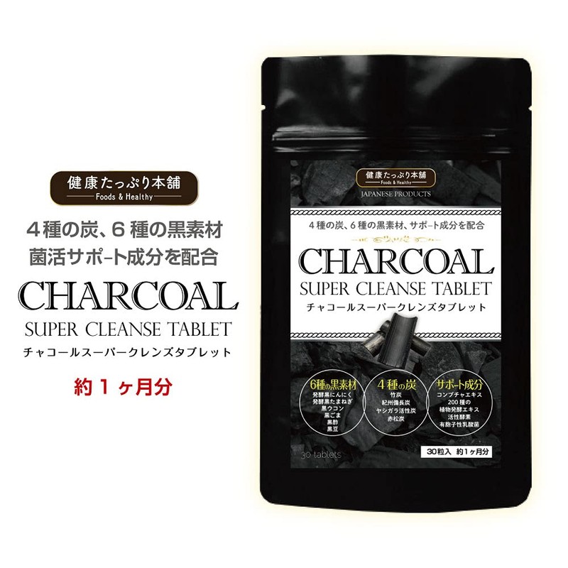 チャコールスーパークレンズタブレット 約1ヶ月分/30粒(国産竹炭、紀州備長炭、活性炭、赤松炭、熟成黒ニンニク、熟成黒たまねぎ、黒ウコン、黒ごま、黒酢、黒豆、コンブチャ、200種の植物発酵エキス、活性酵素、有胞子性乳酸菌)