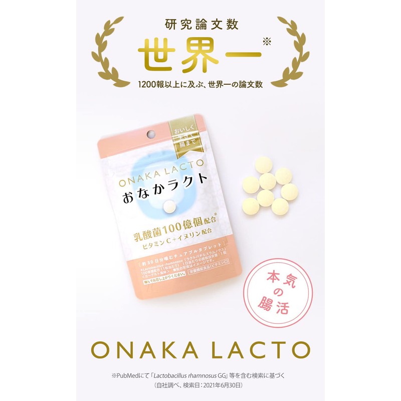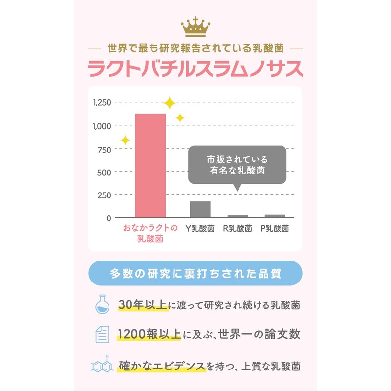 おなかラクトは、世界の医師・研究者に最も研究された『万能型乳酸菌』Lactobacillus rhamnosus(ラクトバチルスラムノサス)を1日当たり100億個配合したサプリメント。