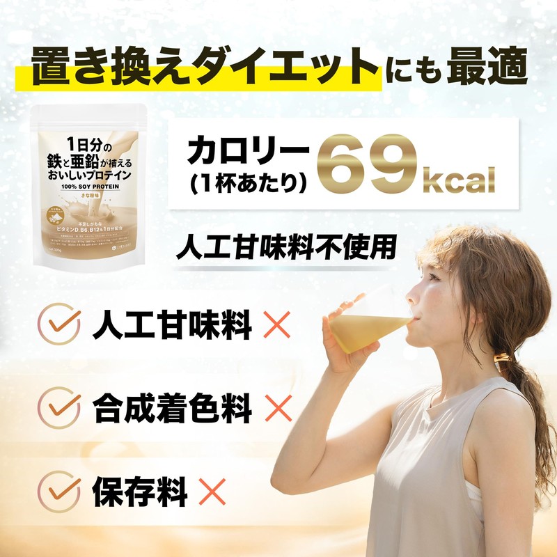 三ツ星ウェルネス 1日分の鉄と亜鉛が補えるおいしいプロテイン 鉄分補給 きな粉味 300g 人工甘味料不使用 ソイプロテイン 鉄分8mg 亜鉛11mg カルシウム ビタミンD ビタミンB12 ビタミンB6 大豆たんぱく 置換えダイエット
