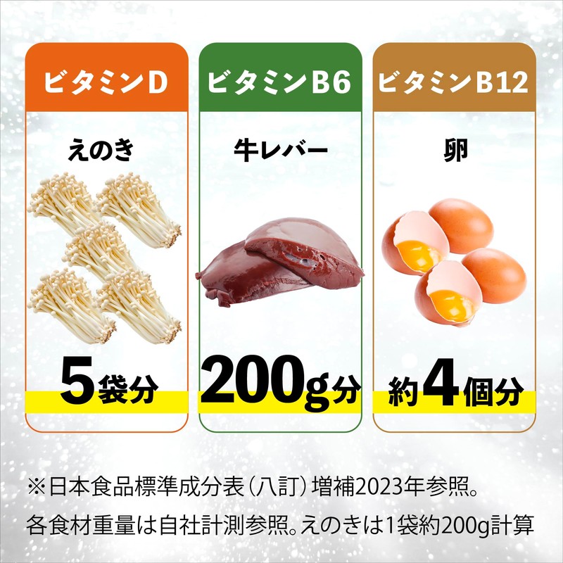 - 栄養機能食品:鉄 亜鉛 カルシウム ビタミンB6 ビタミンB12