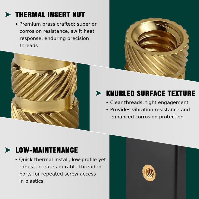 • Heat-Activated Grip /Anti-Spin Knurling: Permanent brass-to-plastic fusion via soldering iron; Cross-knurled design resists more torque vs. tapped plastic threads; No glue, no stripping – just drill, heat, and secure