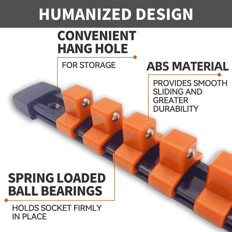 - Convenient to Use: Removable end cap, easy to add or remove clips. Each clip features spring-loaded ball bearings that firmly hold the sockets in place, making it easy to find the right socket when you need it.