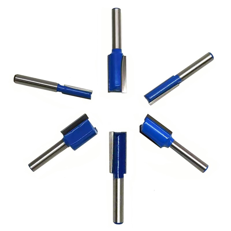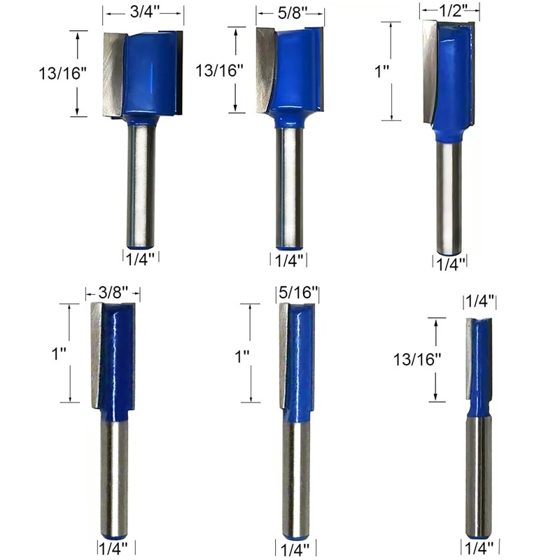 - 6-Piece Straight Router Bit Set —— Includes multiple cutting diameters (1/4", 5/16", 3/8", 1/2", 5/8", 3/4") and a 13/16" cutting height for versatile woodworking applications. Carbide Tipped 2 Flute: 6pcs straight router bit set with 1/4 shank