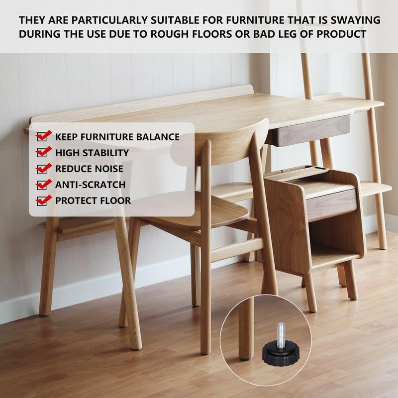 - Adjustable Leveling: With their threaded design, these furniture feet allow for easy height and leveling adjustments. You can easily adapt them to uneven floors or surfaces, ensuring stability and balance.