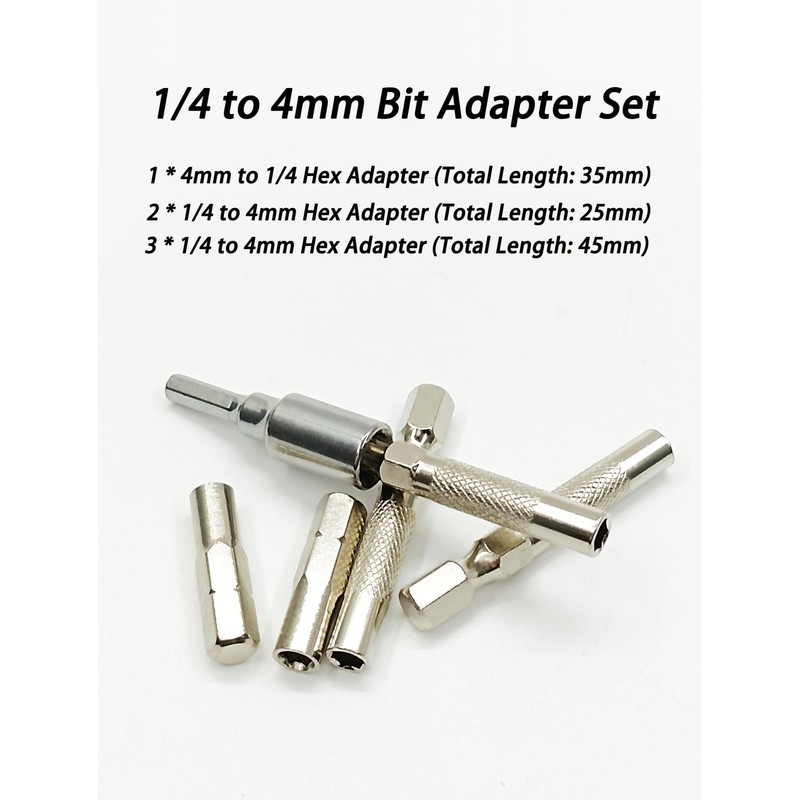 - Package include: 3 pcs 45mm length 1/4 outside to 4mm inside hex bit adapter, 2 Pcs 25mm length 1/4 outside to 4mm inside hex bit adapter, 1 pcs 35mm length 4mm outside to 1/4 inside hex bit adapter