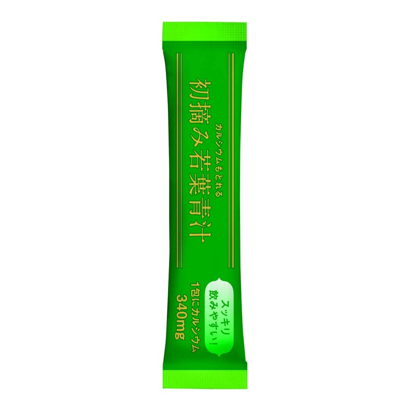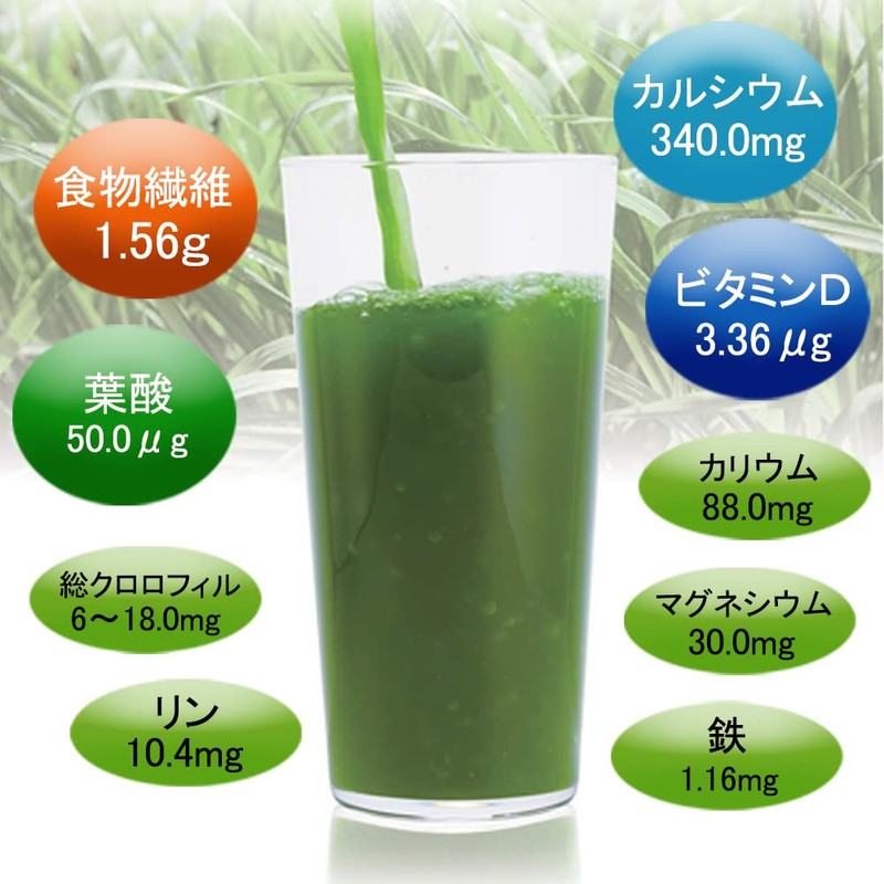 - 【栄養成分】1包(4g)あたり エネルギー:8.63kcal、たんぱく質:0.56g、脂質:0.12g、炭水化物:2.09g(糖質:0.59g、食物繊維:1.50g)、食塩相当量 0.018g、カルシウム:340.0mg、葉酸:50μg、総クロロフィル:6.0~18.0mg、ビタミンD:3.36μg