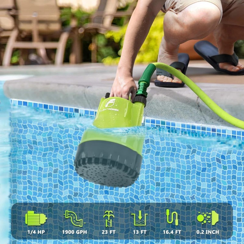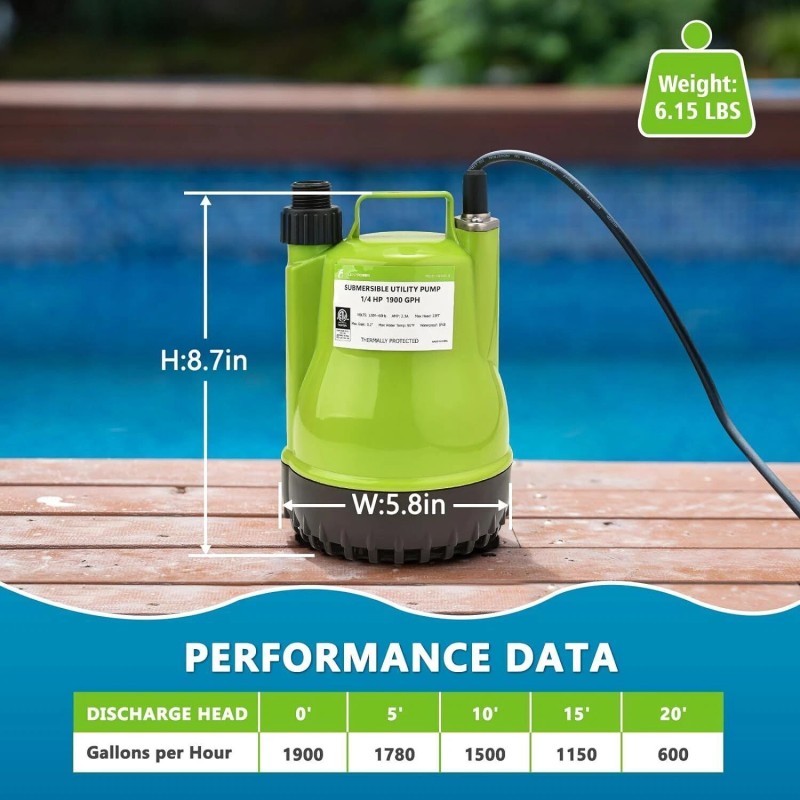 ✔️【EFFICIENT UTILITY PUMP】1/4 HP powerful motor offers a Maximum flow rate of 1900 Gallons Per Hour with 1" discharge hose horizontally. This pump has the ability to lift water up to Max 23 ft of vertical height, and its Max immersion depth is 13 ft. Draining clean or slightly dirty water with Max solid 0.2".