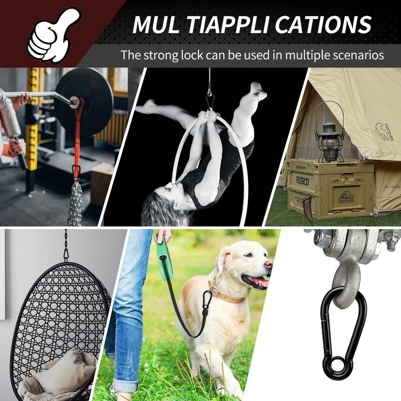 - MULTIPURPOSE SNAP HOOK: Our heavy duty carabiners is perfect for a variety of indoor and outdoor activities, such as camping, hiking, backpacking, trekking, cycling, fishing, hunting, travel, and even organizing your keys, bags, or other items at home or in the office. You can also use it as a carabiner key ring or as a leash for your pets. IMPORTANT NOTE : NOT applicable for climbing or hanging hammock.