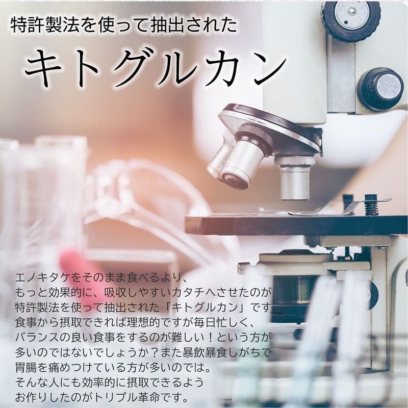 - 【エノキタケ由来成分】キトグルカンは特許製法で成分を抽出しています。より効果的に成分を摂取できるよう工夫しています。