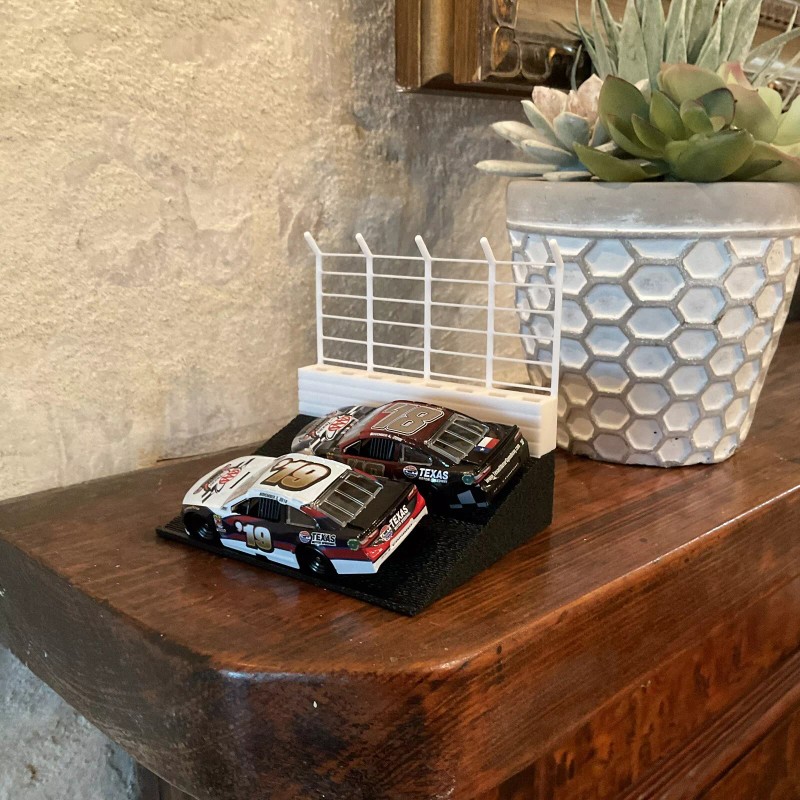Immerse yourself in the world of motorsports with this intricately designed display featuring a sloped track and catch fence.