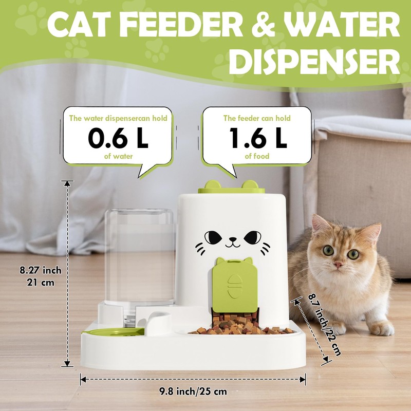 1.6L Auto Gravity Pet Feeder and 0.6L Water Dispenser Set, Automatic Cat Food and Water Dispenser, Gravity Pet Feeder for Small Medium Dog Puppy Cat Kitten (Green)