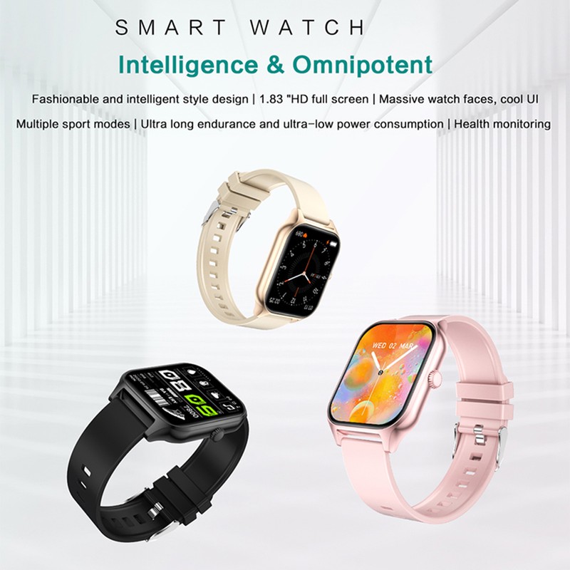 1.83 Inches Smartwatch IP67 Waterproof Sports Watch is not just a sports watch but also can satisfy daily needs such as time function, health management, weather notification, calculator, and more functions for you to discover.  You can choose from 4 colors - Black/Pink/Golden/Silver (Optional). The strap is also available in two materials: Silicone/Milanaise Steel(Optional).