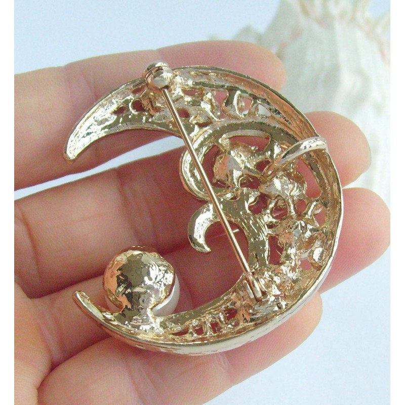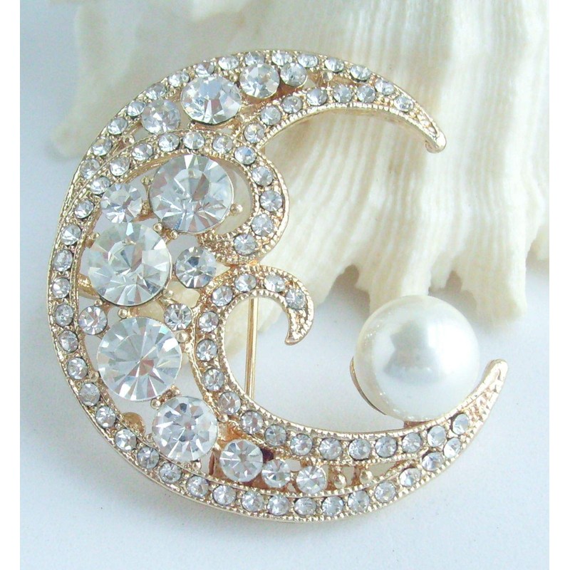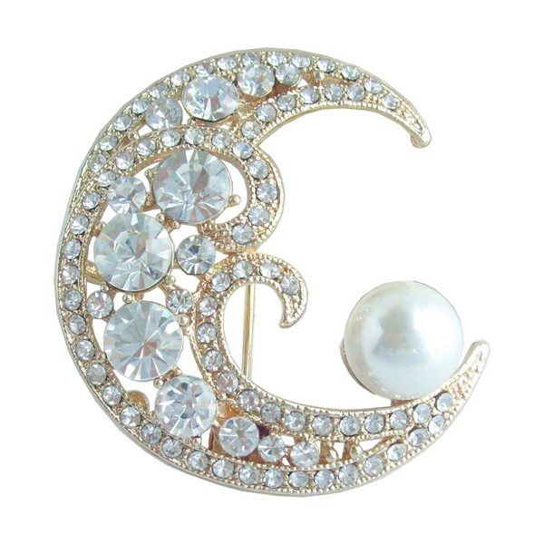 1.97" Pearl Austrian Crystal Half Moon Brooch Pin Pendant UKB5817 (Gold-Tone Clear)