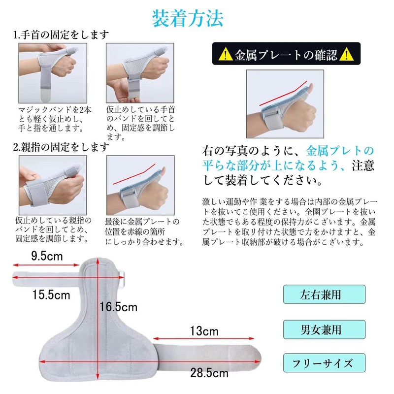 • 【金属プレート内蔵】 優れた通気性と固定性能を併せ持ち、マジックテープをバックルに通して留めます。手首の形に沿って曲げられる軽い金属プレート1枚(取り外し可能)が内蔵されていますので、手首をがっちりと固定して無駄な動きを防ぎます。金属プレートを抜いてもある程度の手首固定力があるため、激しいスポーツなどをする場合は、プレート外してください。