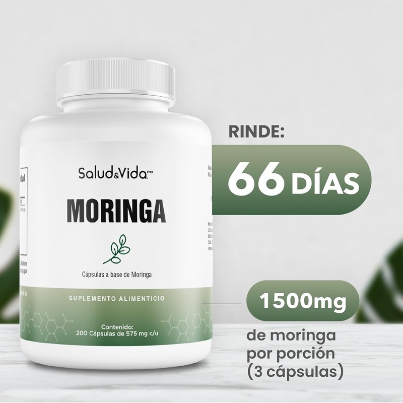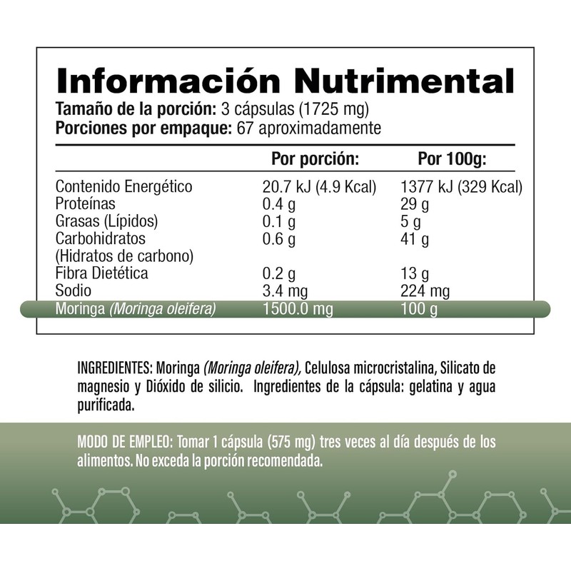 Moringa (Moringa oleifera) 1500 mg por porción (3 cápsulas) Modo de empleo: Tome 3 cápsulas por día. Cápsula a base de gelatina y agua purificada. “Libre de conservadores” “Libre de parabenos” “Libre de colorantes y saborizantes artificiales” “Sin lactosa” y “Sin gluten”. Contiene 0 mg de Magnesio Elemental. ESTE PRODUCTO NO ES UN MEDICAMENTO. EL CONSUMO DE ESTE PRODUCTO ES RESPONSABILIDAD DE QUIEN LO RECOMIENDA Y QUIEN LO USA.