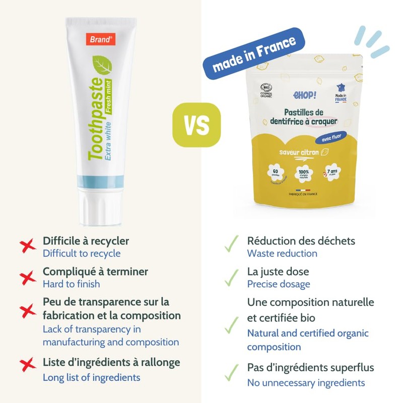 - 100% made in France: formulated with high-quality ingredients for environmentally friendly care of teeth and the environment.