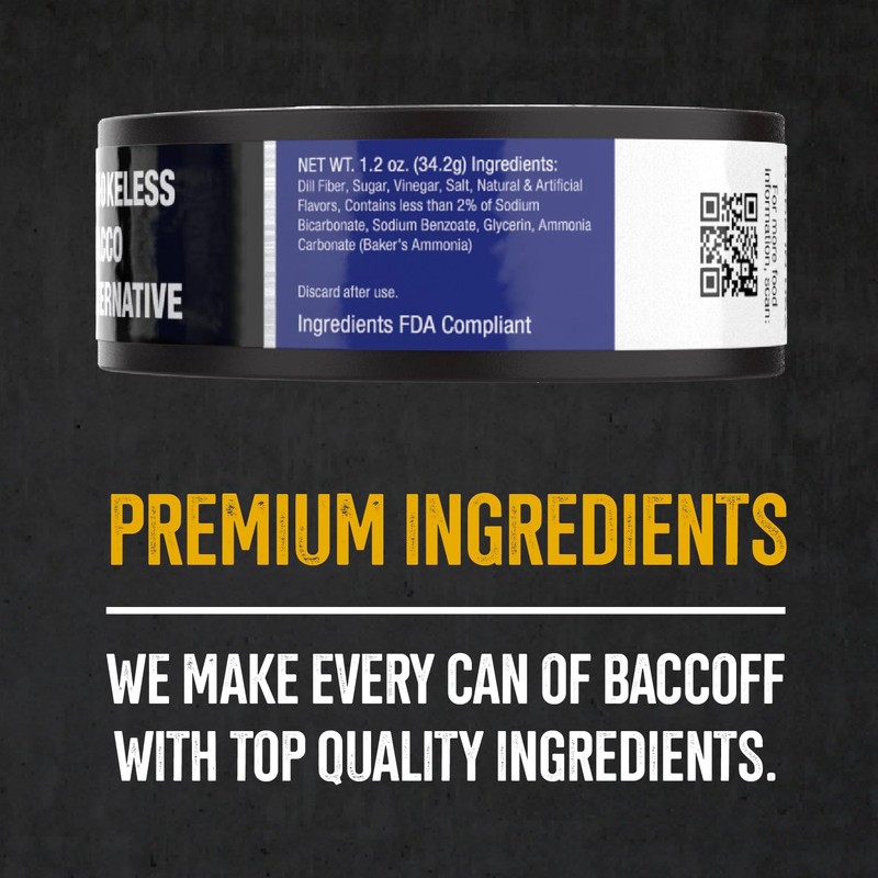 - Food-grade ingredients. Spitting is preferred by most people, but swallowing is safe with BaccOff too.
