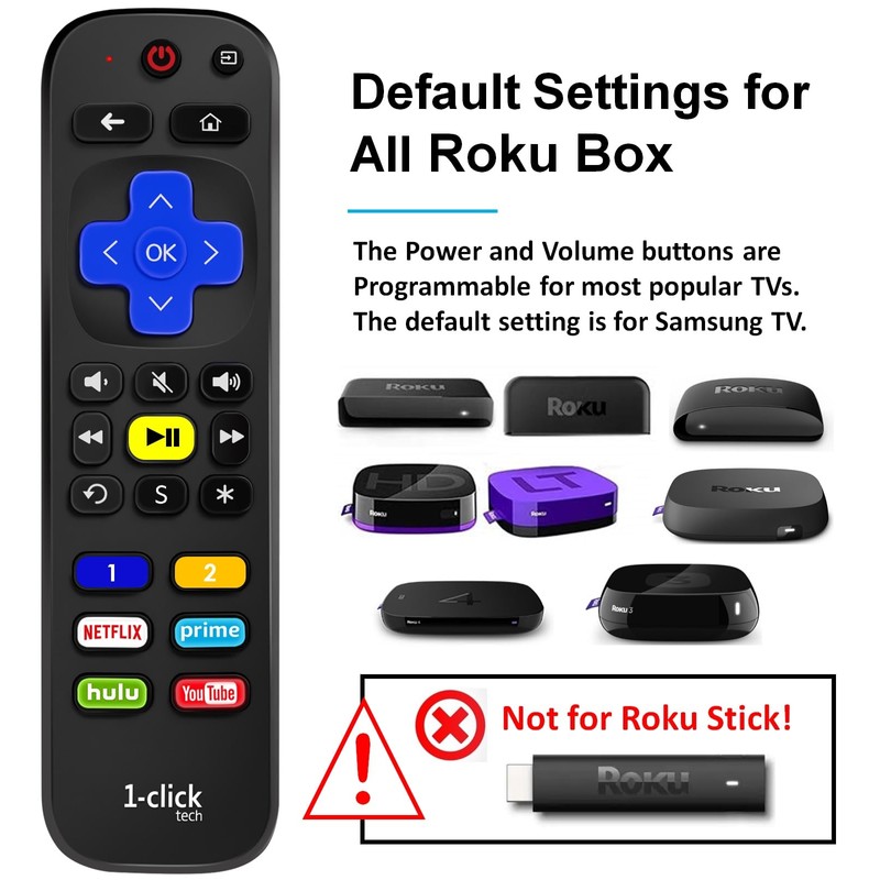 1-Clicktech Remote for Roku TVs and Players Express Premiere Ultra [2-in-1 w/TV Power+Volume] [NOT for Roku Stick]