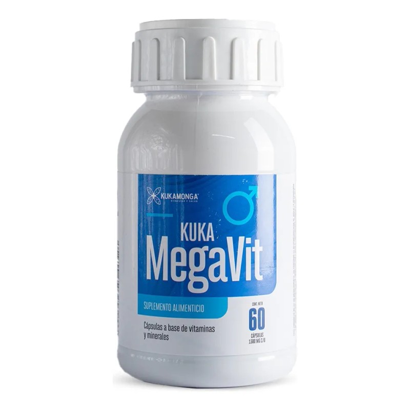 Mega complejo vitamínico con vitaminas B, C, D y minerales esenciales.