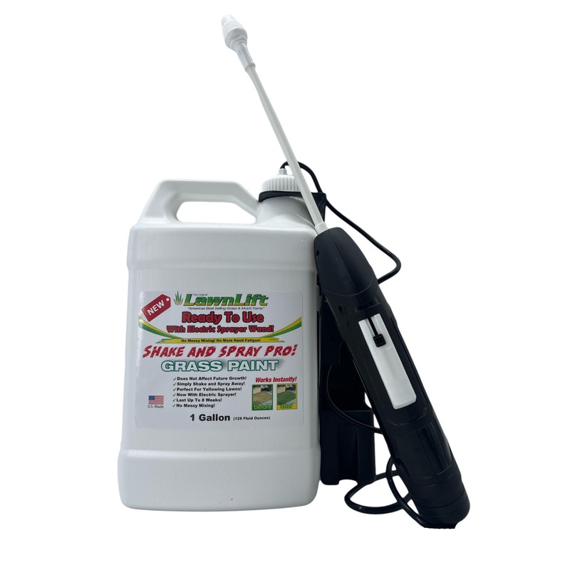 1-gallon Lawnlift ready to use grass paint, shake and spray pro with electric sprayer wand. No more messy mixing. Instantly transform your lawn.