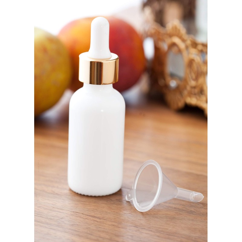 1 oz Opal White Glass Boston Round Bottle with Gold Metal and Glass Dropper (6 pack ) + Funnel I Refillable Empty Storage Containers