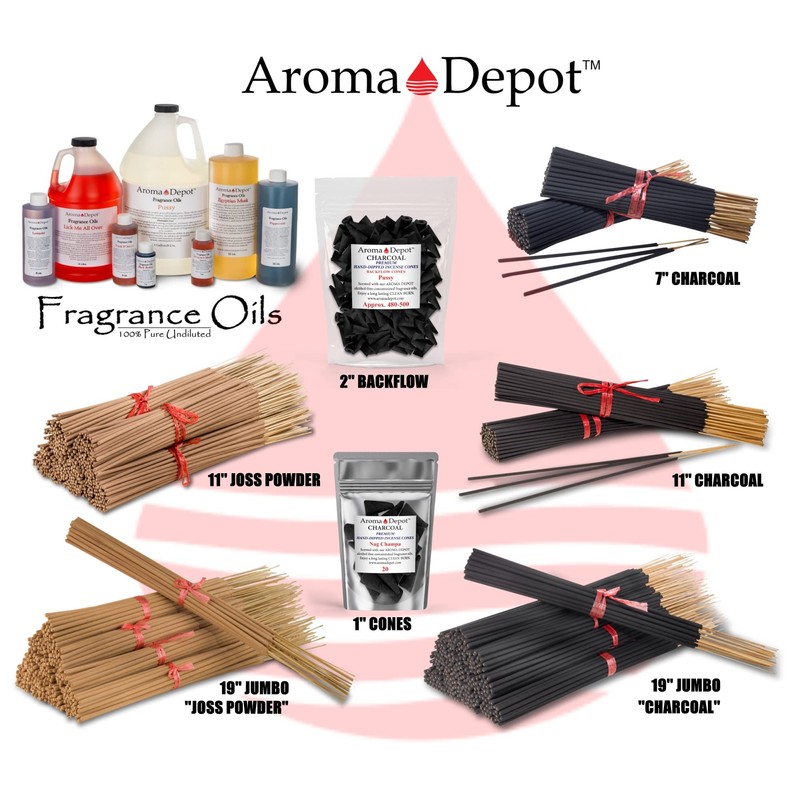 - At Aroma Depot, you'll find an extensive range of fragrance oils and essential oils. We're thrilled to announce that we've decided to expand our offerings due to the overwhelmingly positive response to our charcoal incense sticks. Our new product line includes 1'' topflow and 2'' backflow charcoal incense cones and our 7'', 11'', and 19'' charcoal and natural scented or unscented incense sticks. Don't forget to explore our vast collection of fragrance oils as well.