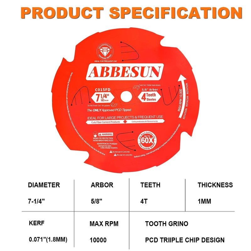 - 【LONG LASTING】- ABBESUN D0704DH fit for Diablo 7-1/4 inch Hardie Blade Fiber Cement Blade with 4 polycrystalline diamond-tipped teeth offers up to 75X longer cutting life than standard carbide blades. Extended the long life of the circular saw blade, ideal for cutting heavy-duty fiber cement.