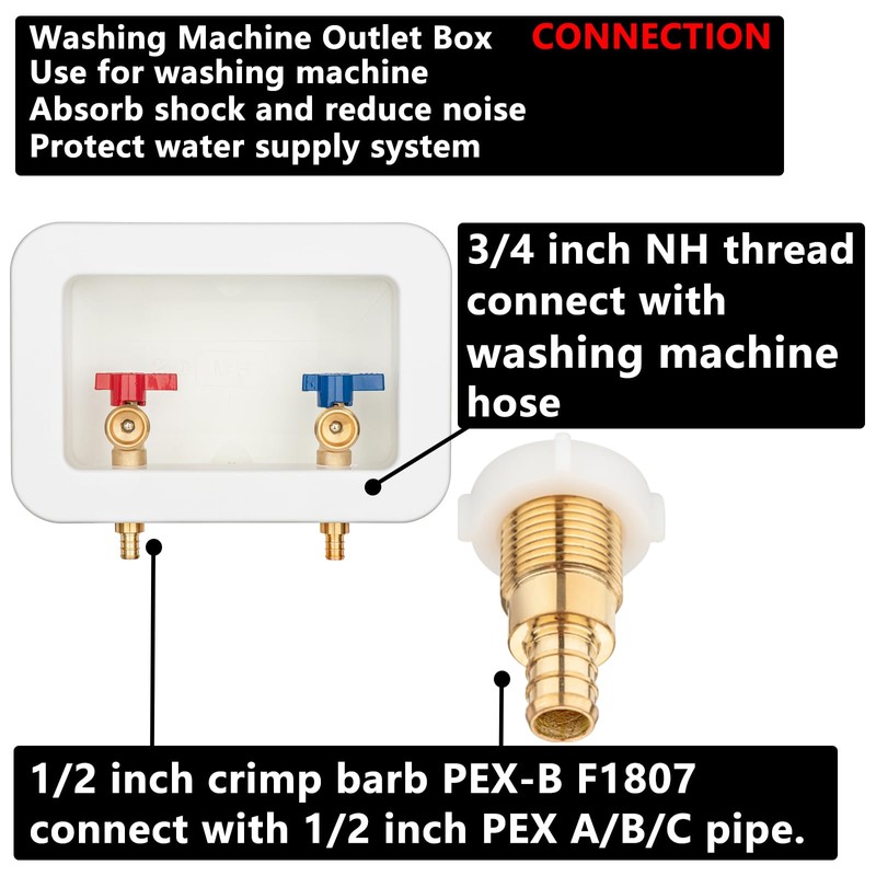 - Inlet: 1/2 inch PEX-B F1807 Crimp Barb connect with 1/2 inch PEX A/B/C pipe.