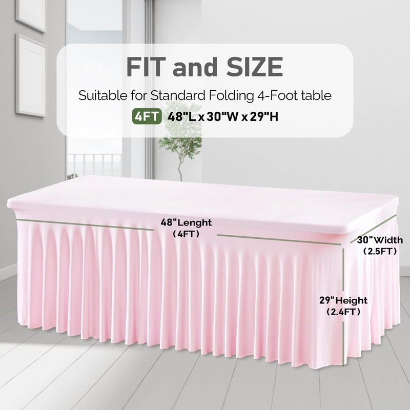 - 【Easy To Setup 4 ft Table Cloth with Skirts】- Fitted table cloth fits to 4 ft standard foldable rectangular 6 foot tables. No assembly or any additional velcro or pegs needed. Just pull it over the banquet or trade show craft table and enjoy. The skirt of the table cloth was not just straight. It had loose pleats and flowed very nicely, will be the perfect addition to your event.