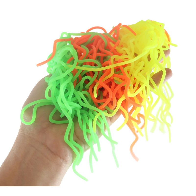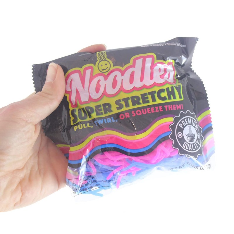 • These stretchy strings can be stretched out forever (almost). These have a nice soft hairy and floppy texture and the noodles are packaged in a cute Ramen Noodle package. The strings have multiple hairs on them to look like thin ramen noodles.