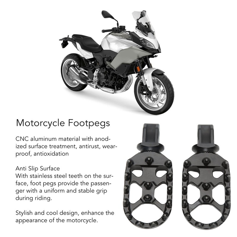 1、Fitment: Motorcycle rear foot pegs are professionally designed, replacement for F900R 2020‑2022, replacement for F900XR 2020‑2022. 2、Stable Grip: With stainless steel spike on the foot pedal surface, which provides rear passenger with an even and stable grip during the ride. 3、Adjustable Rear Footrest: Accroding to your needs, the passenger foot pedal can be adjusted to any angle and then locked. 4、High Strength: Made of CNC aluminum, anodized surface, rear footpeg is rustproof, rugged, can be used in harsh environments. 5、Cool and Stylish: Exquisite workmanship, fashionable and cool design, rear passenger foot pedals will improve the appearance of the motorcycle.