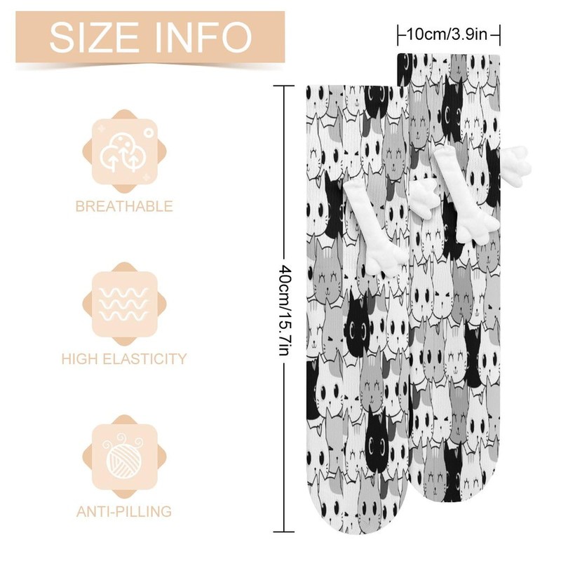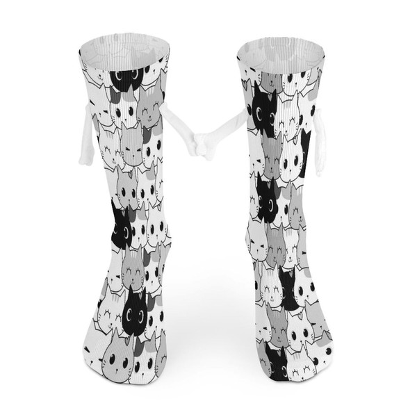 1 Pair Soft Socks White Holding Hands, Compression Knee High Stockings Long Athletic Circulation 16x3.9 in Print Seamless Black White Grey Doodle Cat Kitten Heads Animal Pets Texture