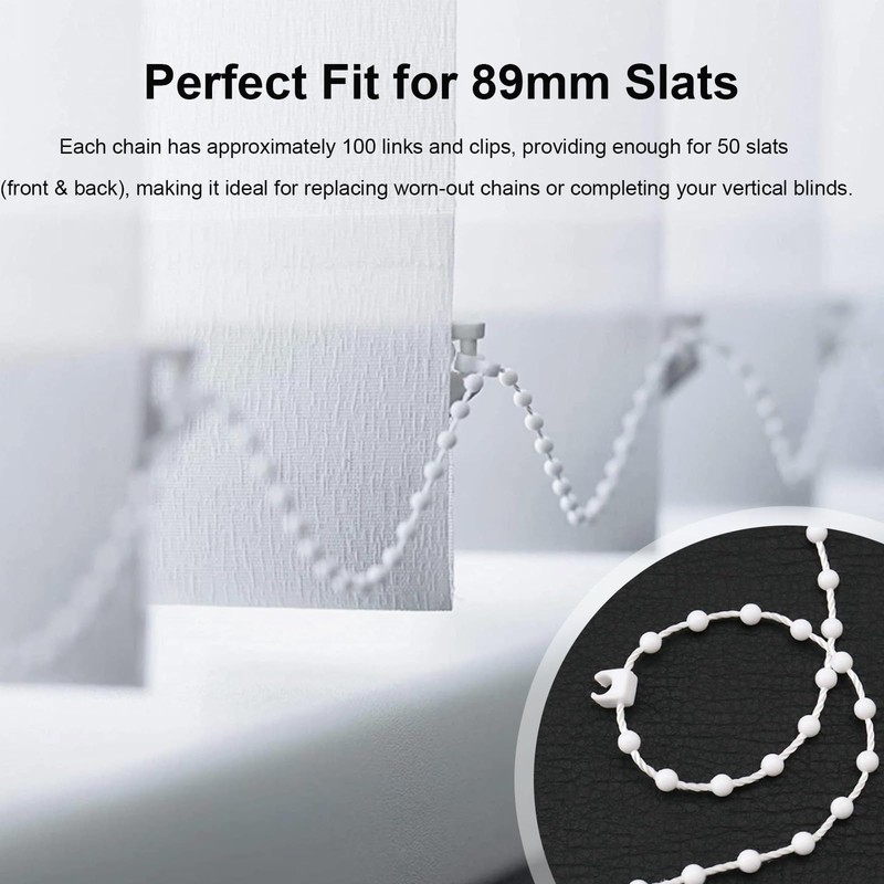 - 【Perfect Fit for 89mm Slats】This white vertical blind beaded bottom chain is specifically designed to fit 89mm (3.5") fabric vertical blinds. Each chain has approximately 100 links and clips, providing enough for 50 slats (front & back), making it ideal for replacing worn-out chains or completing your vertical blinds.