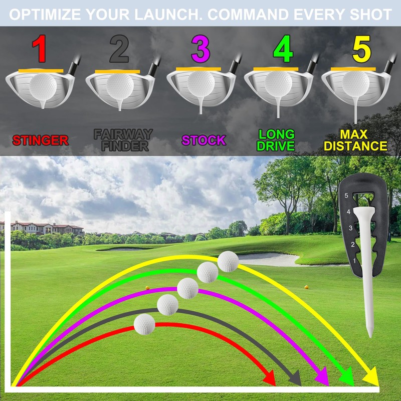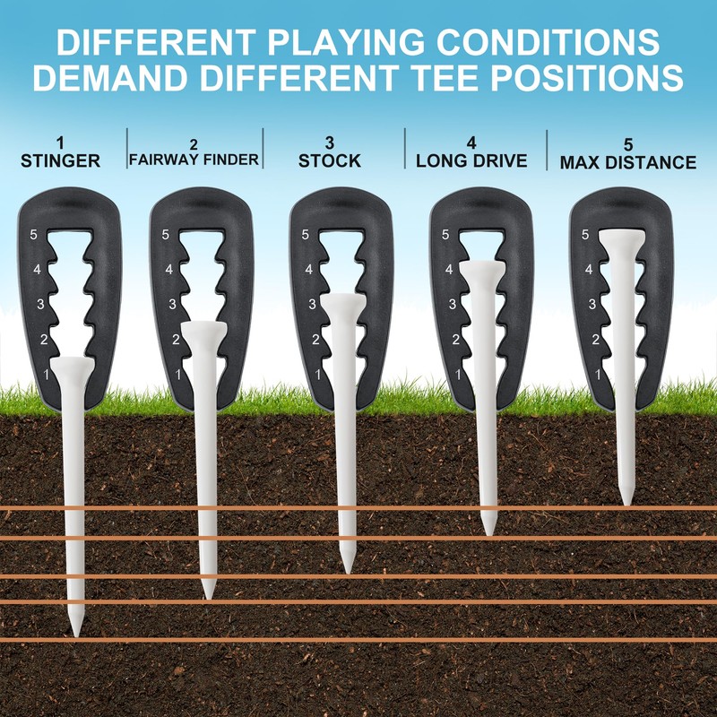 - 【5-Level Optimize Ball Flight & Distance】Dial in the perfect tee height to maximize carry with high tees, balance trajectories with mid settings, or control flights in wind with low tees. This adjustable golf tee height tool ensures consistent launch angles for longer, more accurate drives.