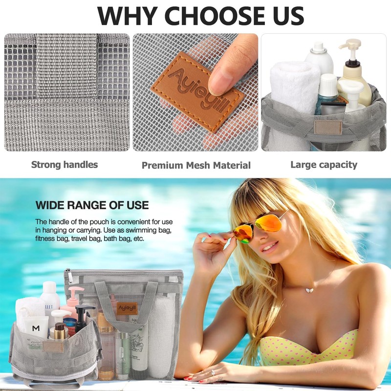 1 Pcs Shower Mesh Caddy Bag Quick Dry Hanging Toiletry and Bath Organizer for Travel and Swimming with Zipper (Grey)